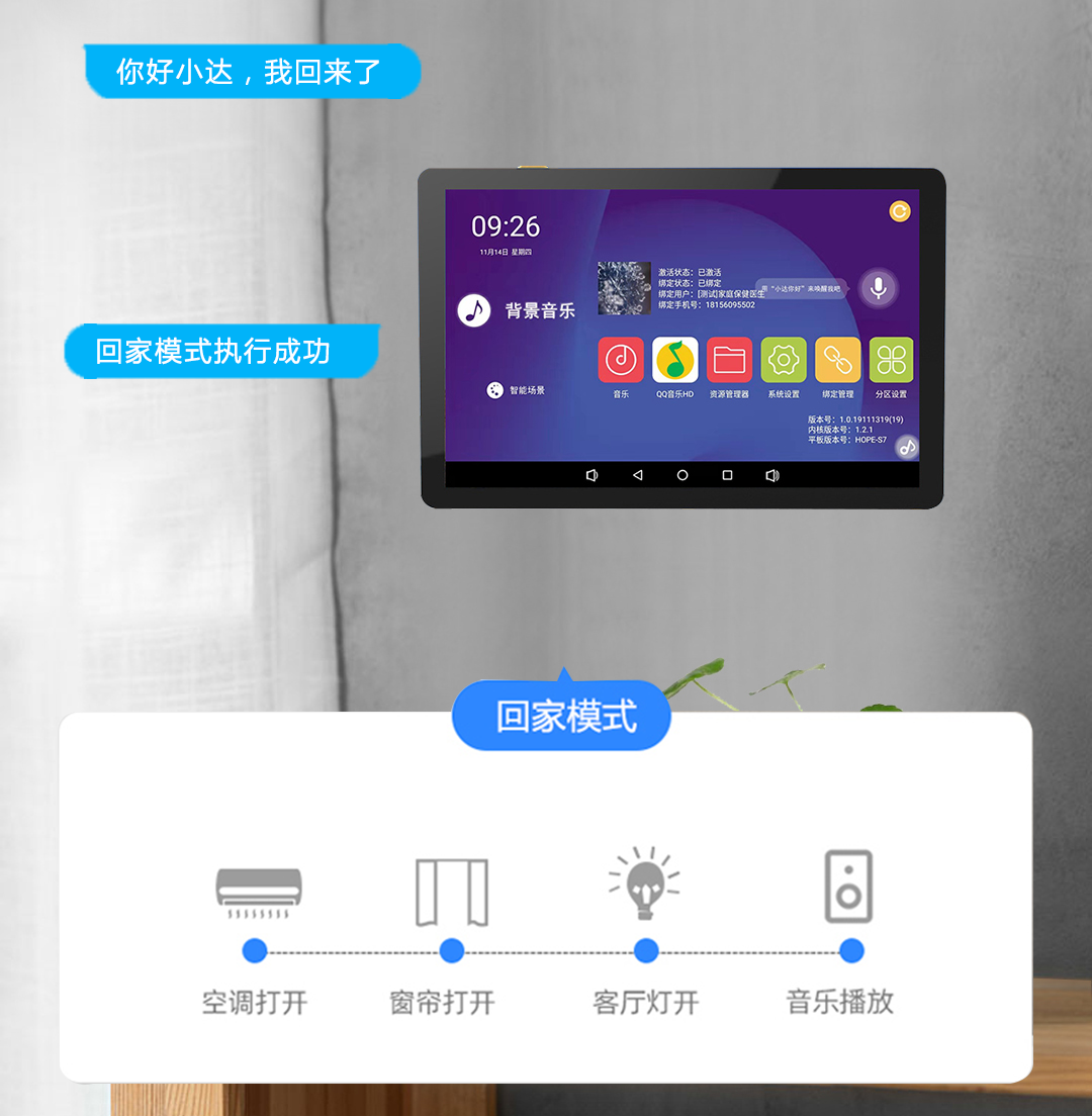 如回家模式:灯光逐个亮起,窗帘缓缓拉开,空调已调整到适宜的温度,舒缓的音乐萦绕在耳旁;离家模式:关闭灯光、窗帘、家电等,启动设防模式;睡眠模式:保持空调打开,关闭其他灯光、家电等等…