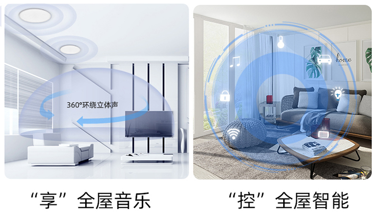 隐藏嵌入式安装,搭配全频立体吸顶扬声器,以室内吊顶作为天然音箱体,融入整体家装风格,带来环绕覆盖式音效、卓越视听体验的同时,却不占用家庭空间。